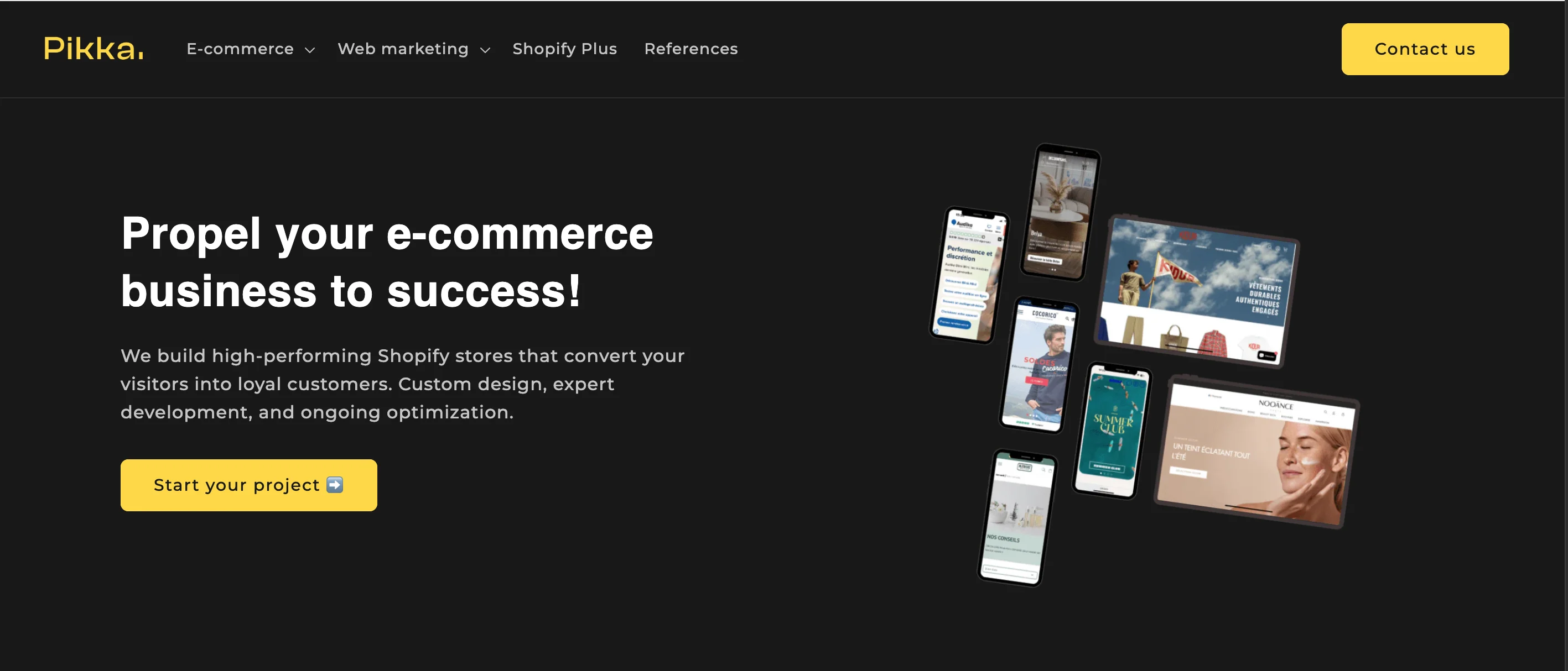 Expertise technique Shopify : Pikka dispose d'une équipe de développeurs et d'intégrateurs spécialisés sur Shopify et Shopify Plus. Ils optimisent les performances, sécurisent les paiements et gèrent les intégrations tierces pour garantir une boutique stable et scalable. Leur expérience permet d'anticiper les problèmes techniques lors des pics d'activité.
