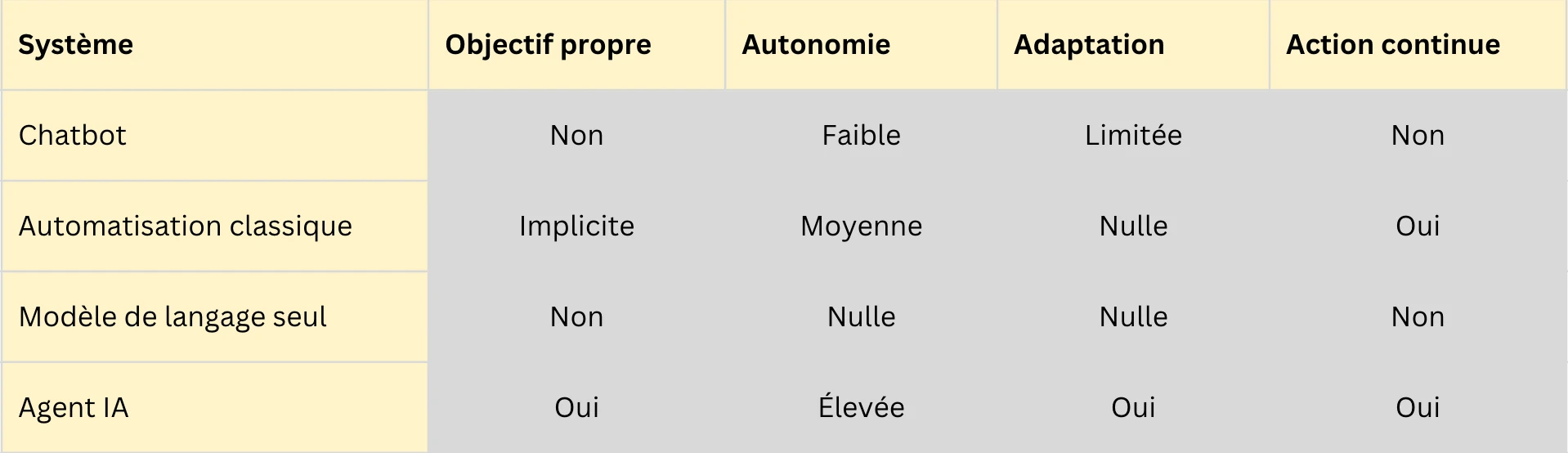 Ce tableau met en évidence le point central. L’agent IA combine autonomie, objectif et adaptation, là où les autres systèmes n’en possèdent qu’une partie.