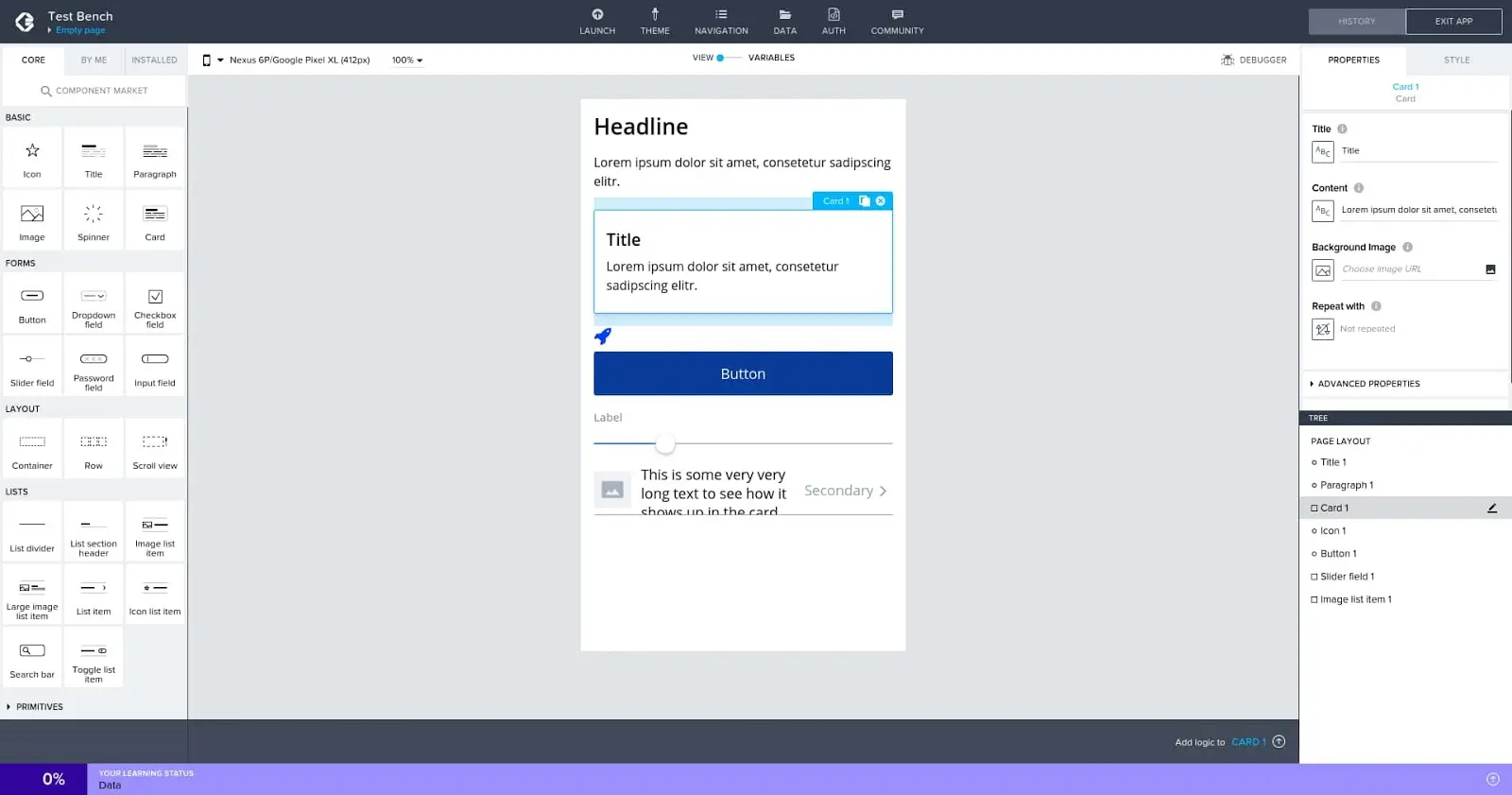 La première fonctionnalité clé d’Appgyver est son éditeur visuel no-code extrêmement complet, permettant de construire des interfaces utilisateur complexes par simple glisser-déposer, sans toucher une ligne de code. Cela facilite la collaboration entre développeurs et non-développeurs.