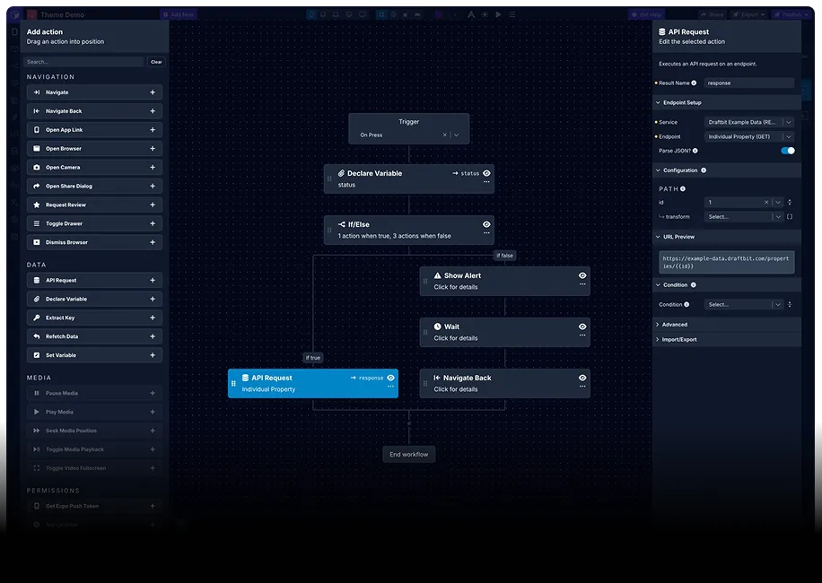 Parmi les fonctionnalités avancées de Draftbit, on trouve la gestion intégrée des données avec la possibilité de connecter facilement des APIs externes, ce qui enrichit grandement les applications créées sans nécessiter de développement supplémentaire.