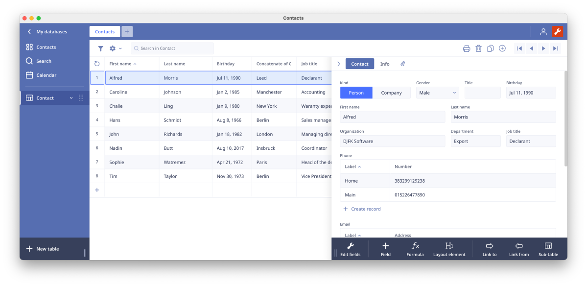La première fonctionnalité majeure de Ninox est sa capacité à créer des bases de données personnalisées grâce à une interface intuitive et un modèle low-code. Les utilisateurs peuvent définir des tables, des relations et des vues avec une grande liberté et sans coder.
