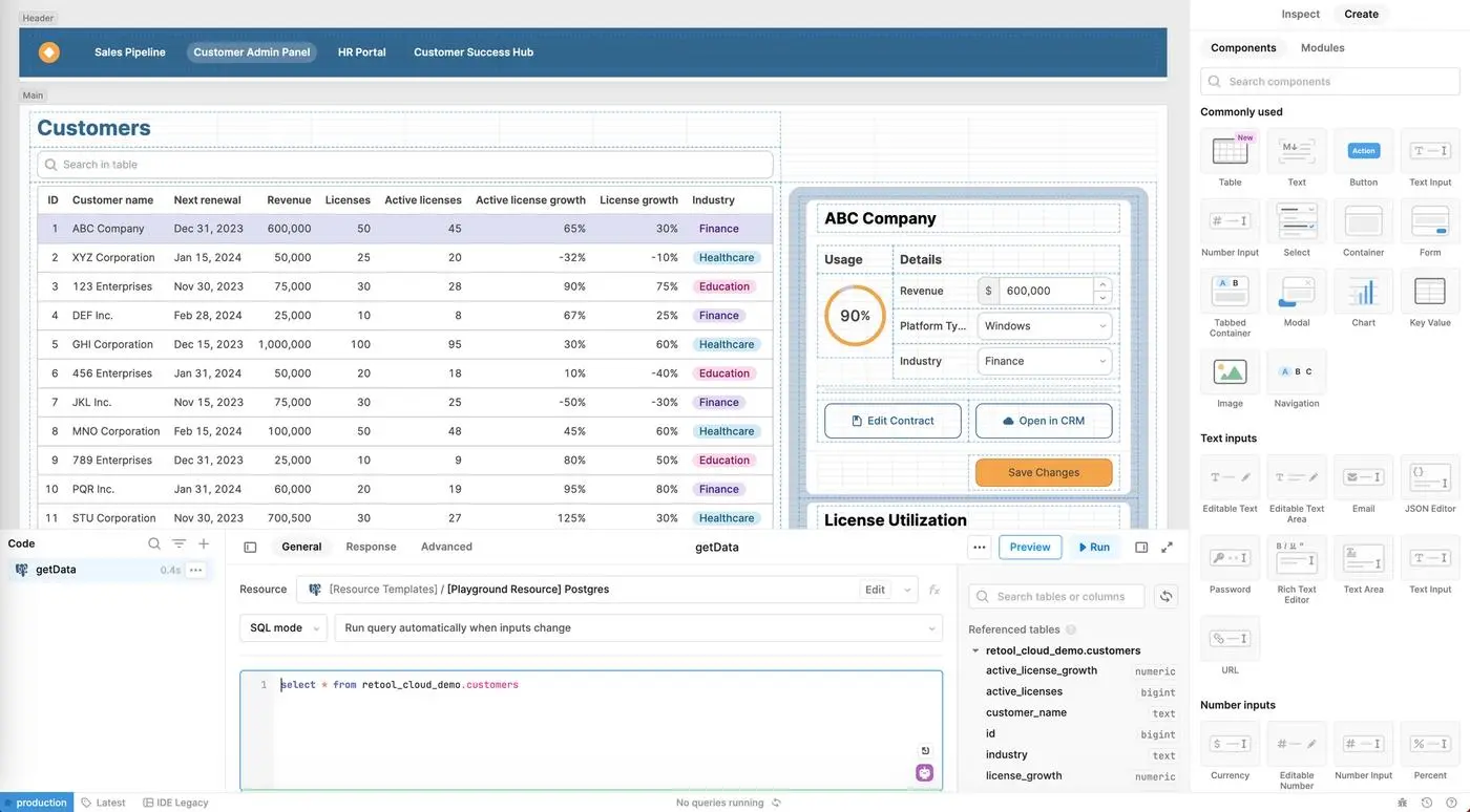 Ensuite, Retool propose des possibilités d’écriture de scripts JavaScript et SQL directement intégrées pour étendre les comportements et logiques métiers, offrant ainsi une personnalisation avancée tout en restant dans l’environnement low-code. Ces options permettent de dépasser les simples interfaces statiques pour construire de véritables outils dynamiques et interactifs adaptés aux besoins spécifiques.