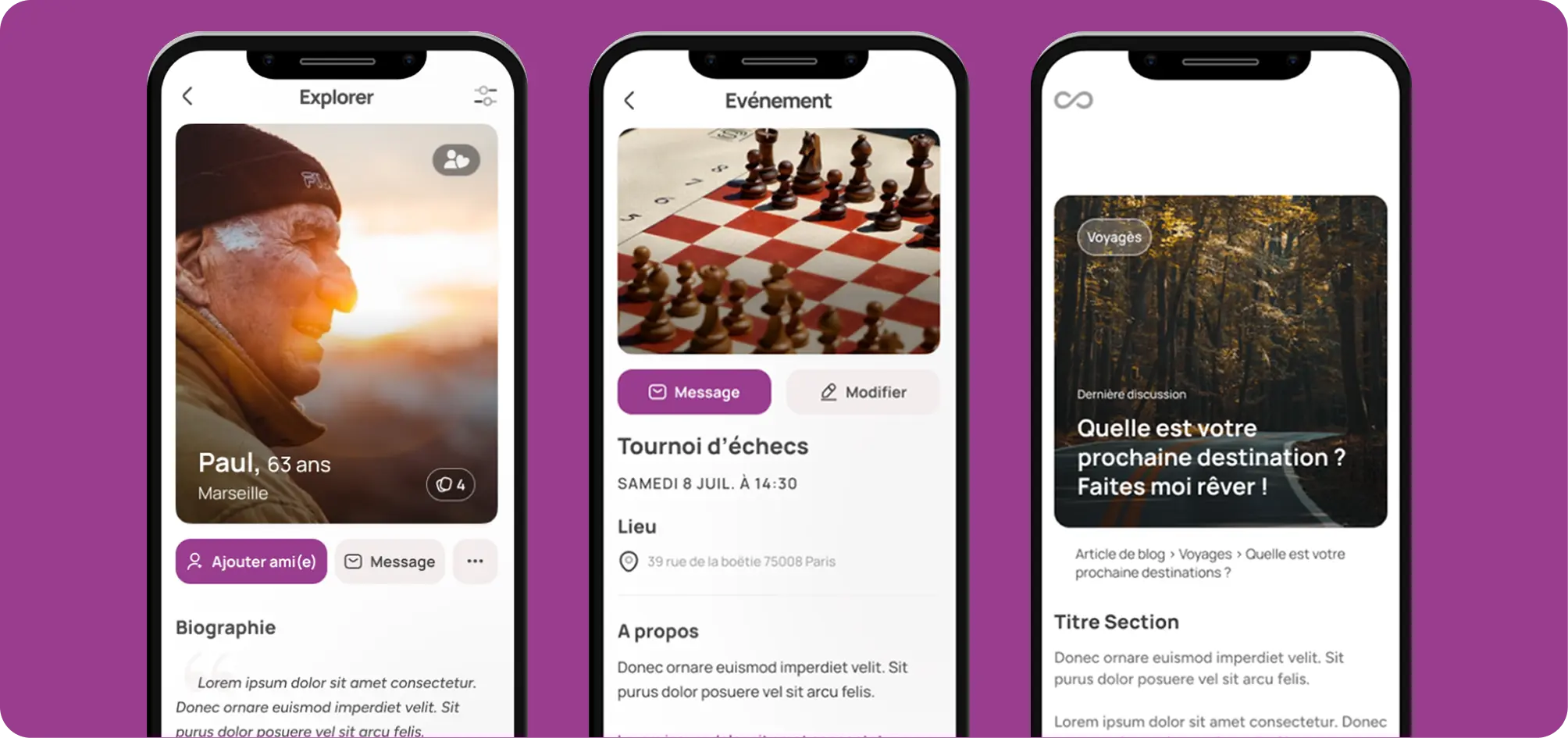 Application mobile permettant aux seniors de se retrouver autour d’activités, sorties et passions communes.