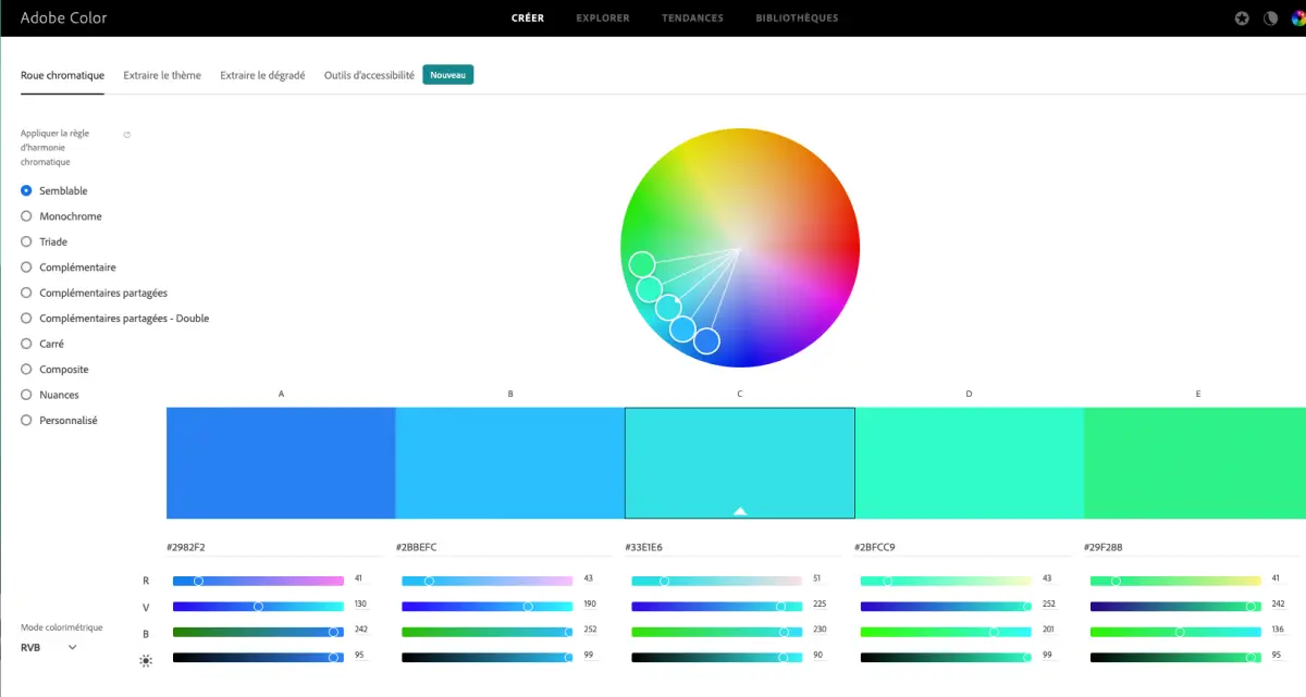 En tant qu'entrepreneur chez Easy Web, je peux vous dire que la cohérence visuelle est notre obsession. Adobe Color, je l'utilise presque au quotidien pour sa capacité à générer des harmonies chromatiques. Vous partez d'une couleur, et l'outil vous propose instantanément des palettes complémentaires : monochromatiques, triadiques, analogues... C'est un gain de temps colossal et la certitude d'une base solide pour toute création.
