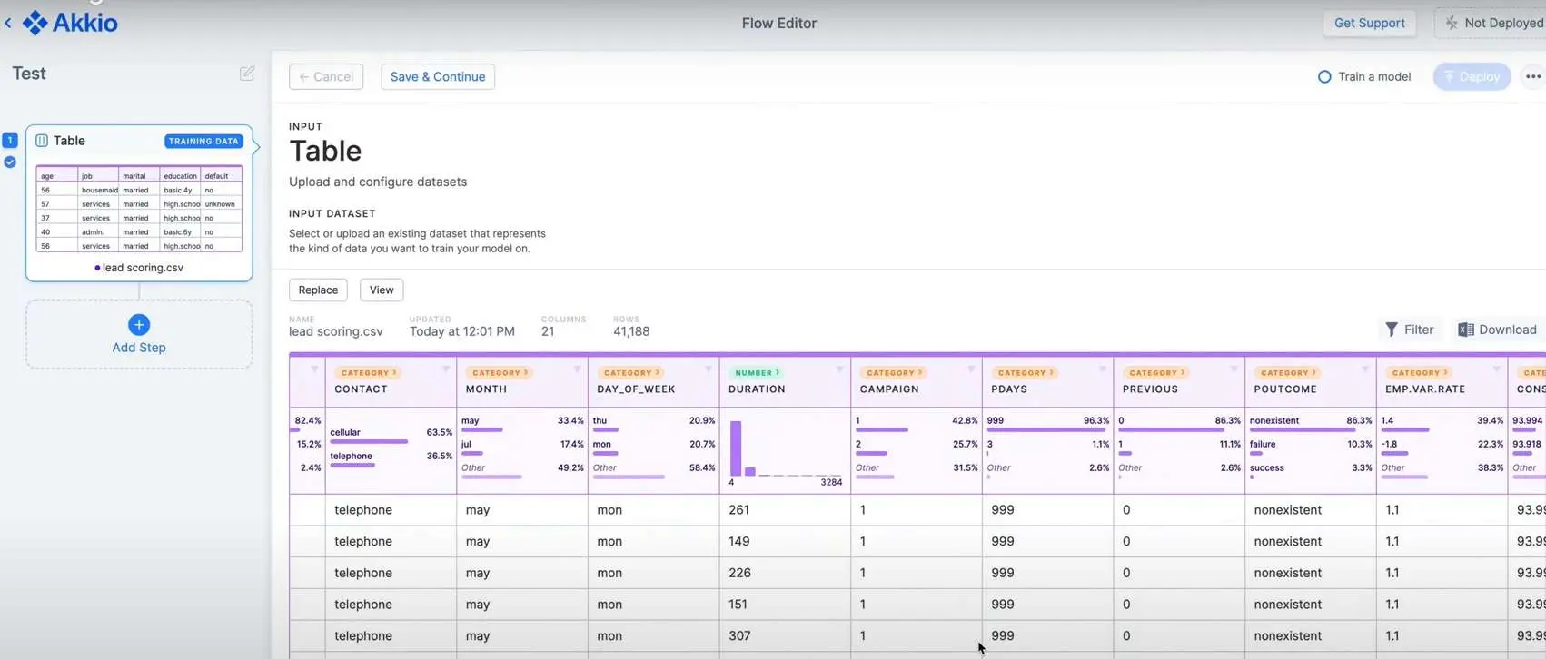 La fonctionnalité clé d’Akkio est sa plateforme de machine learning no code, qui permet de créer, entraîner et déployer des modèles prédictifs en quelques clics depuis une interface graphique simple.