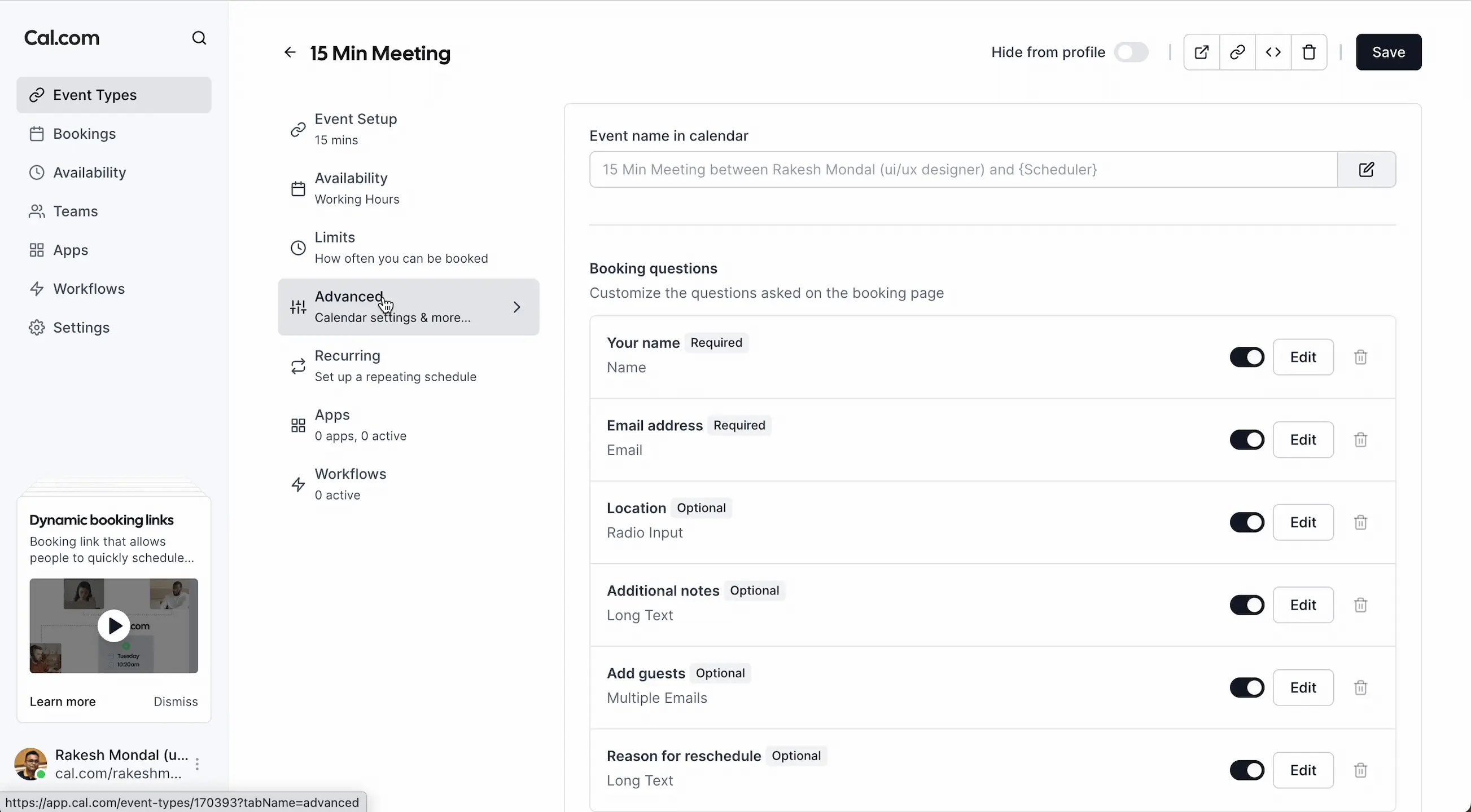 Parmi les fonctionnalités avancées, Cal.com propose des workflows personnalisables permettant d’adapter le parcours utilisateur selon différents scénarios, par exemple en ajoutant des questions préalables au rendez-vous ou en fixant des durées spécifiques selon le type de meeting.