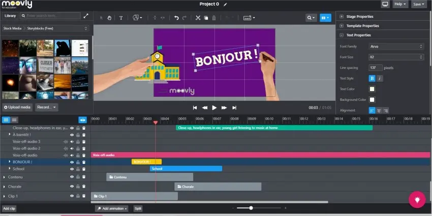 La première fonctionnalité clé de Moovly est sa bibliothèque de contenus multimédias, composée de milliers de vidéos, images, sons et animations prêtes à l’emploi. Cela facilite la création rapide de vidéos animées sans recourir à des éléments externes, ce qui est un vrai gain de temps pour les créateurs.