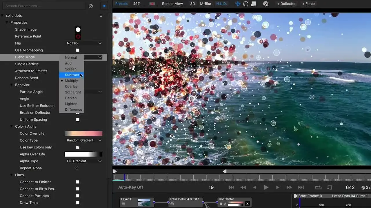 Parmi les fonctionnalités avancées, Particle Illusion propose un système de contrôle granularisé pour régler la vitesse, la gravité, la couleur ou encore la taille des particules, offrant une personnalisation poussée adaptée aux besoins spécifiques des projets.