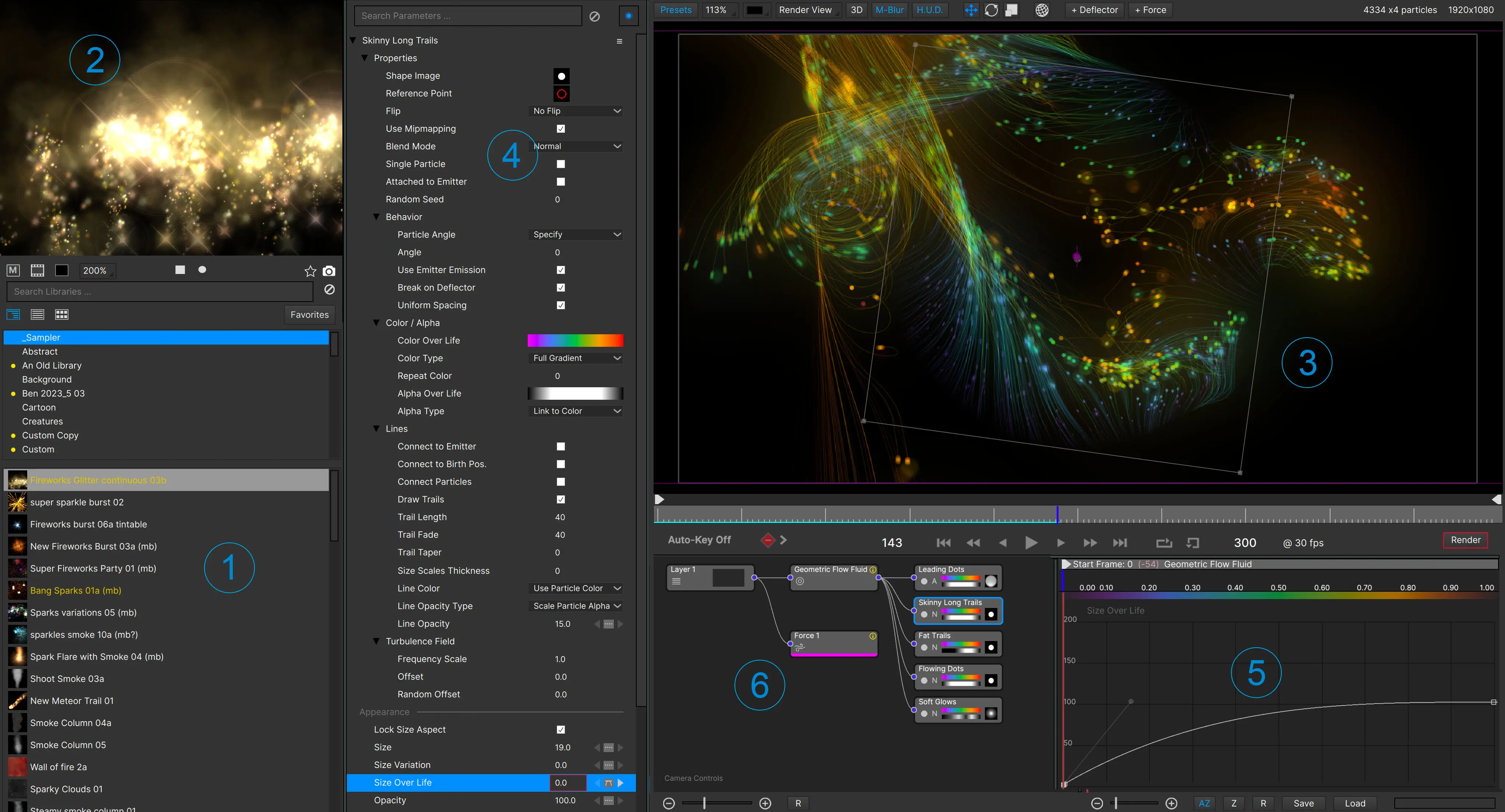 La fonctionnalité clé numéro un de Particle Illusion est sa bibliothèque immense et variée d’effets de particules, allant des explosions, fumées, feux d’artifice, étincelles jusqu’aux effets plus abstraits et artistiques. Ces effets sont instantanément visualisables et modifiables ce qui accélère considérablement la phase de création.