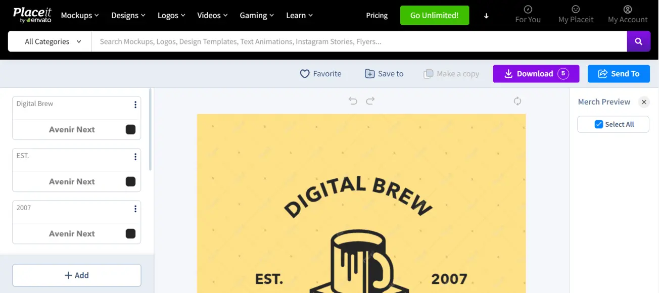 La question de la flexibilité post-création est cruciale. Sur Placeit, vous devez comprendre que chaque téléchargement génère un rendu final – une image JPEG/PNG ou une vidéo MP4. Une fois exporté, ce n'est pas un fichier source modifiable comme un PSD ou un Ai.