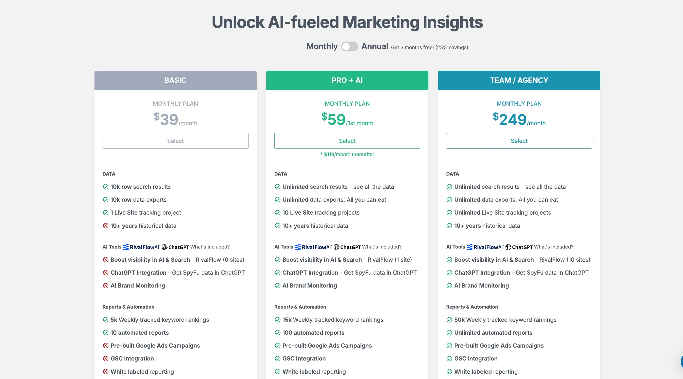 SpyFu propose plusieurs formules adaptées à différents profils d’utilisateurs :