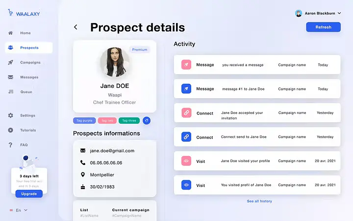 La première fonctionnalité clé de Waalaxy réside dans sa capacité à automatiser efficacement les campagnes de prospection LinkedIn. L’outil permet de créer des séquences personnalisées combinant invitations, messages de suivi, et relances automatisées selon un timing réglable, ce qui optimise la prise de contact sans spammer.