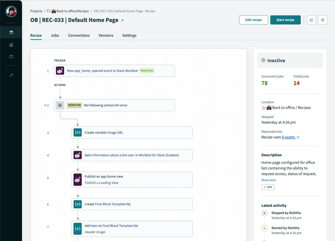 Workato propose une interface relativement intuitive, mais elle reste plus orientée vers des utilisateurs ayant une compréhension préalable de l’automatisation et des workflows. Pour un débutant complet, certaines notions peuvent paraître complexes, notamment lors de la création de scénarios sophistiqués nécessitant des conditions multiples.