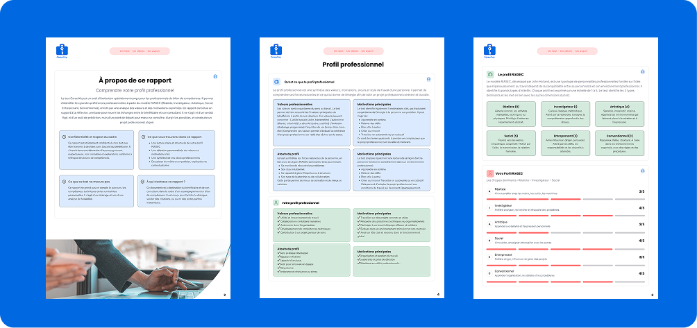 Careerkey est un Saas pour les consultants en bilan de compètences, permettant de tester et rédiger automatiquement un bilan de cométences complets et exploitable par les candiats.