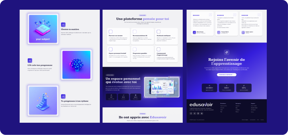 Nous avons travaillé sur le branding et les maquettes d’Edusavoir, en créant une identité visuelle forte et cohérente, ainsi que des interfaces utilisateurs claires et intuitives. Le travail a porté sur la conception des parcours utilisateurs, l’ergonomie des écrans et la déclinaison graphique pour tous les supports, afin de préparer le projet pour le développement et optimiser l’expérience des futurs apprenants.